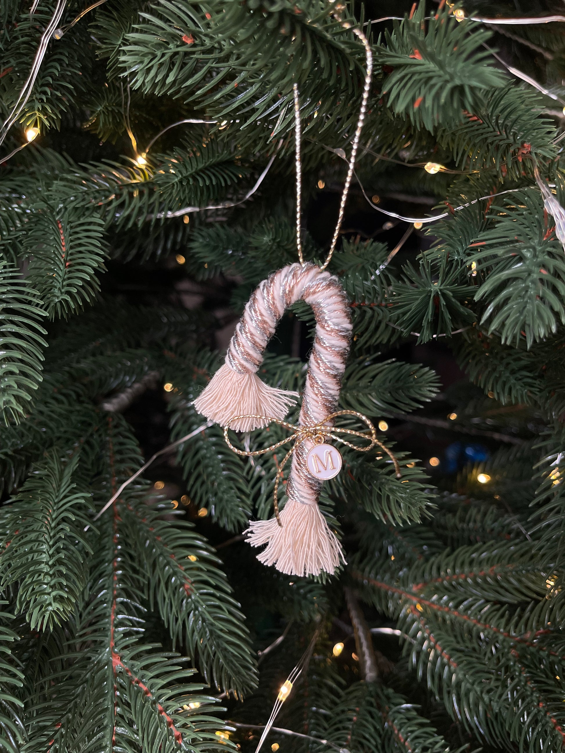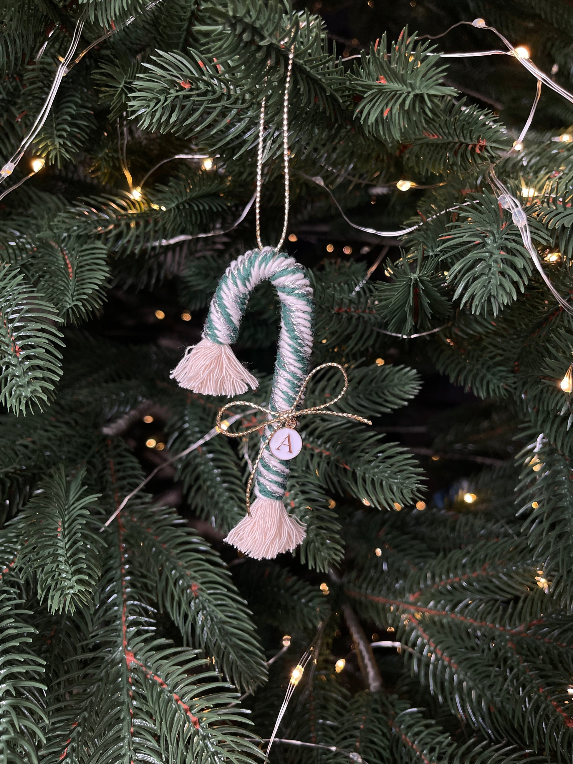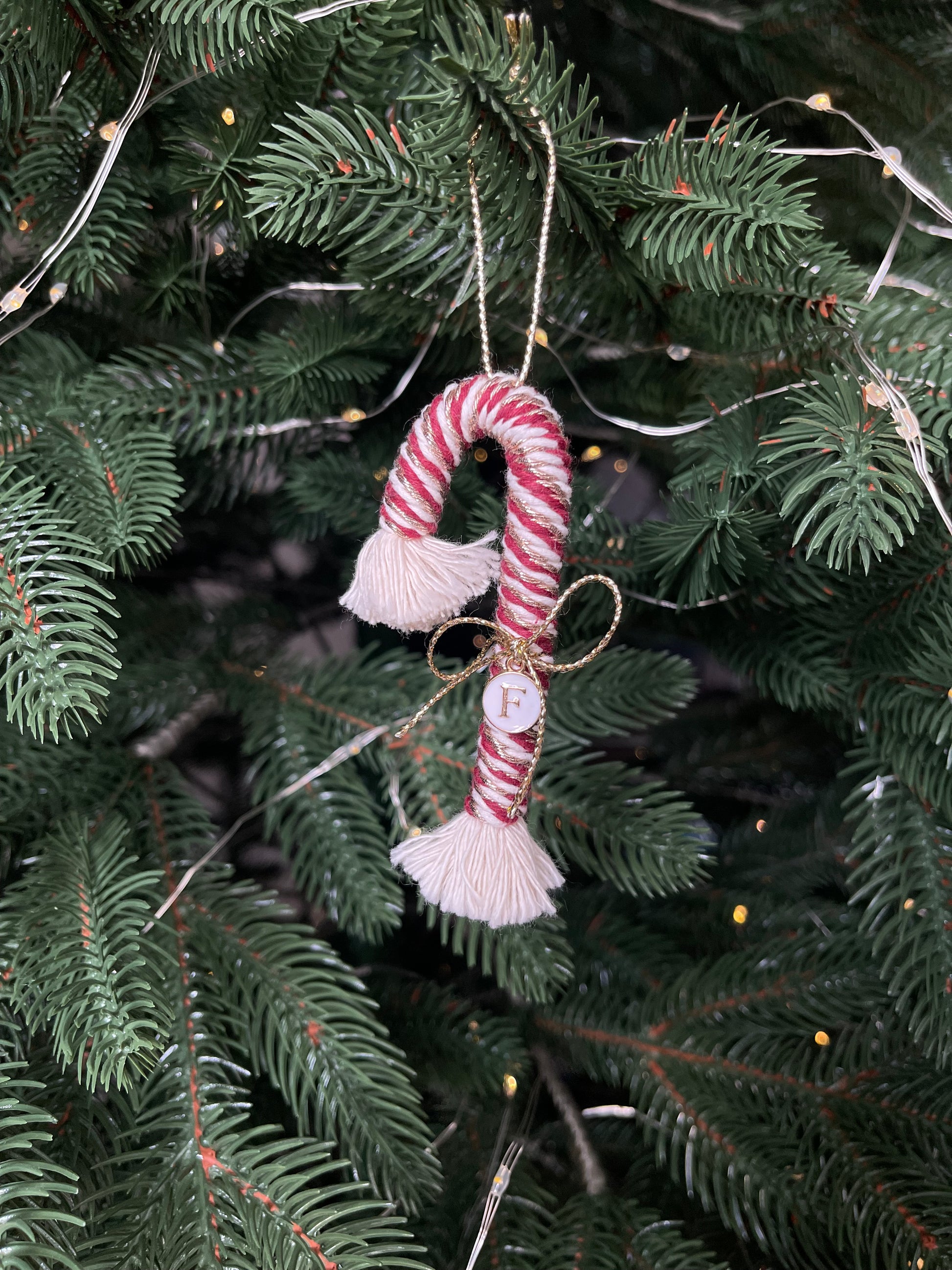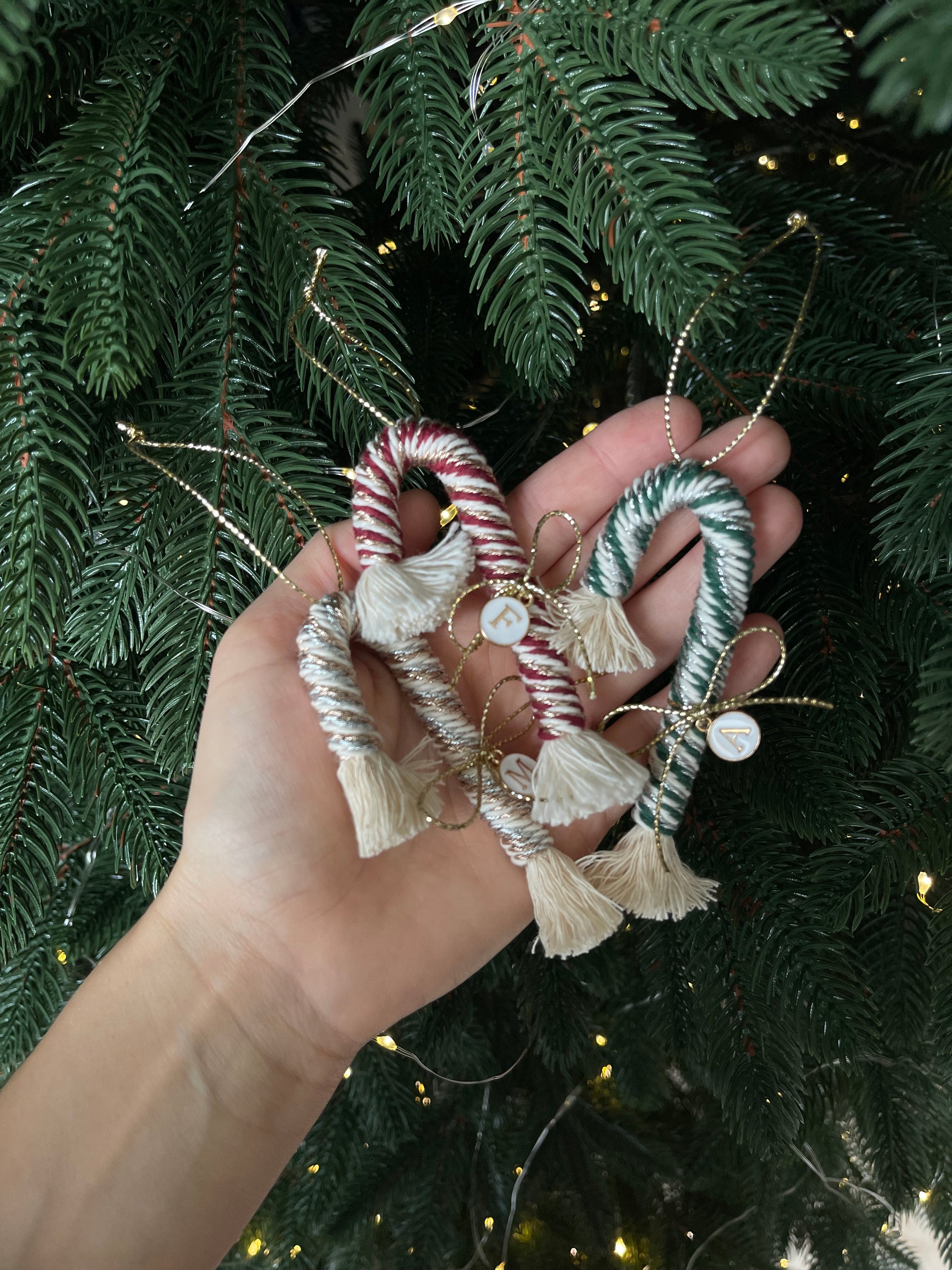 Decorazione realizzata a mano in corda di cotone, modellata nella forma del classico bastoncino di zucchero.