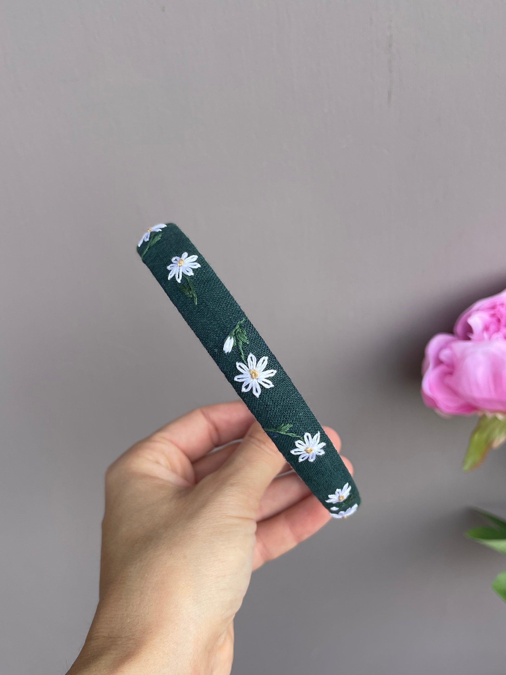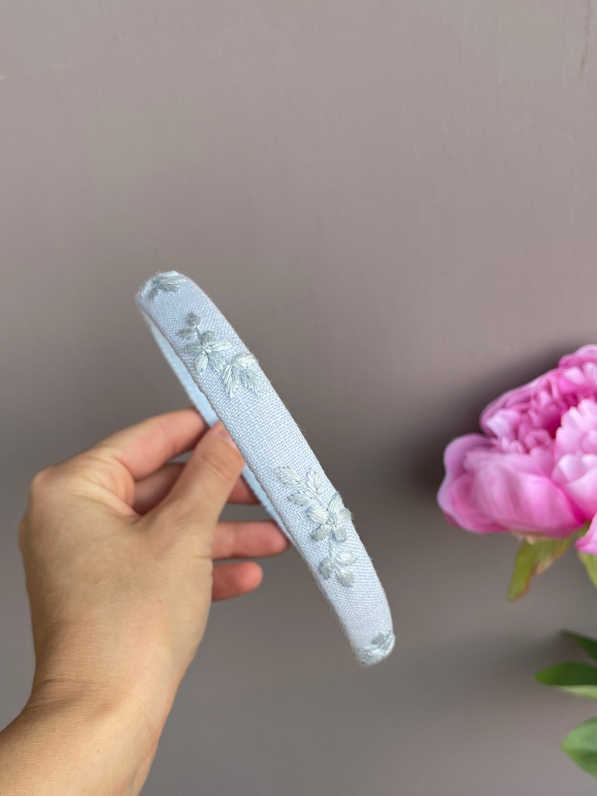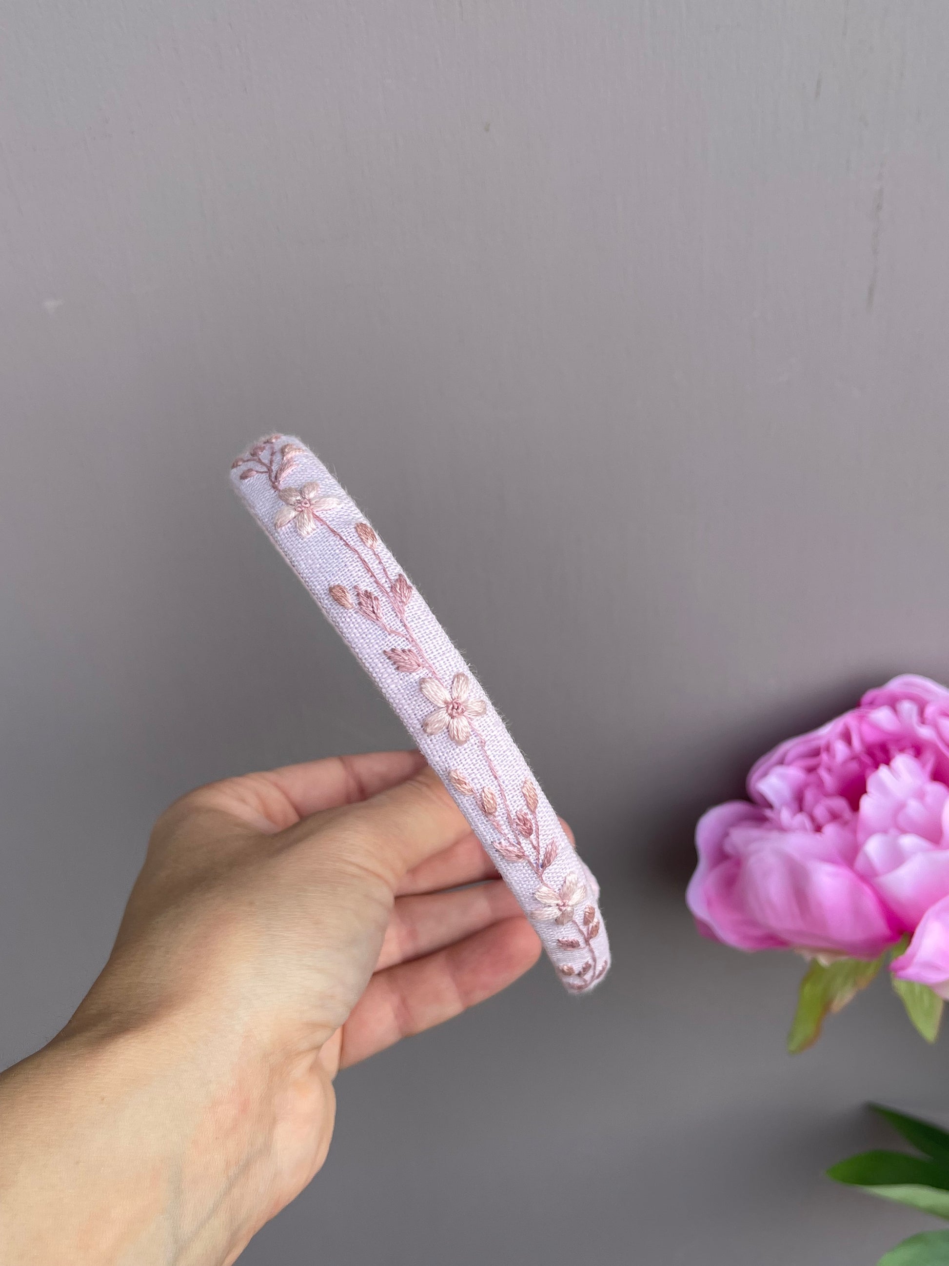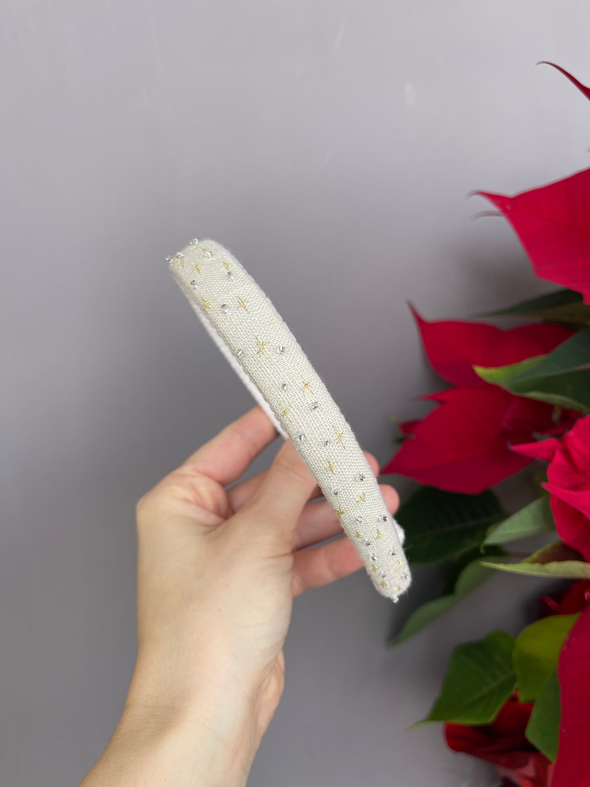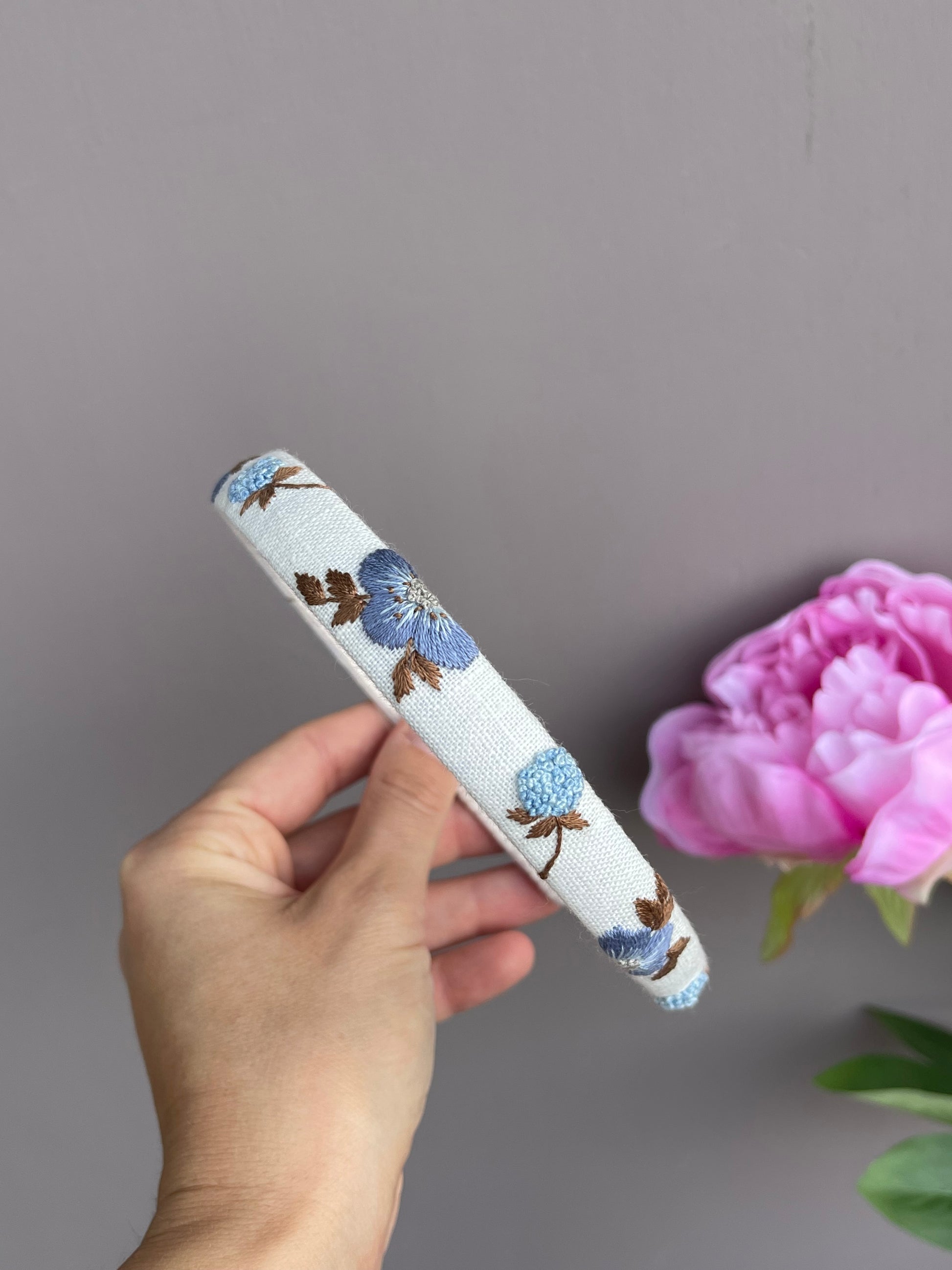 Cerchietti realizzati su una base in plastica flessibile , rivestiti in lino e decorati con ricami eseguiti a mano utilizzando fili da ricamo DMC di alta qualità.