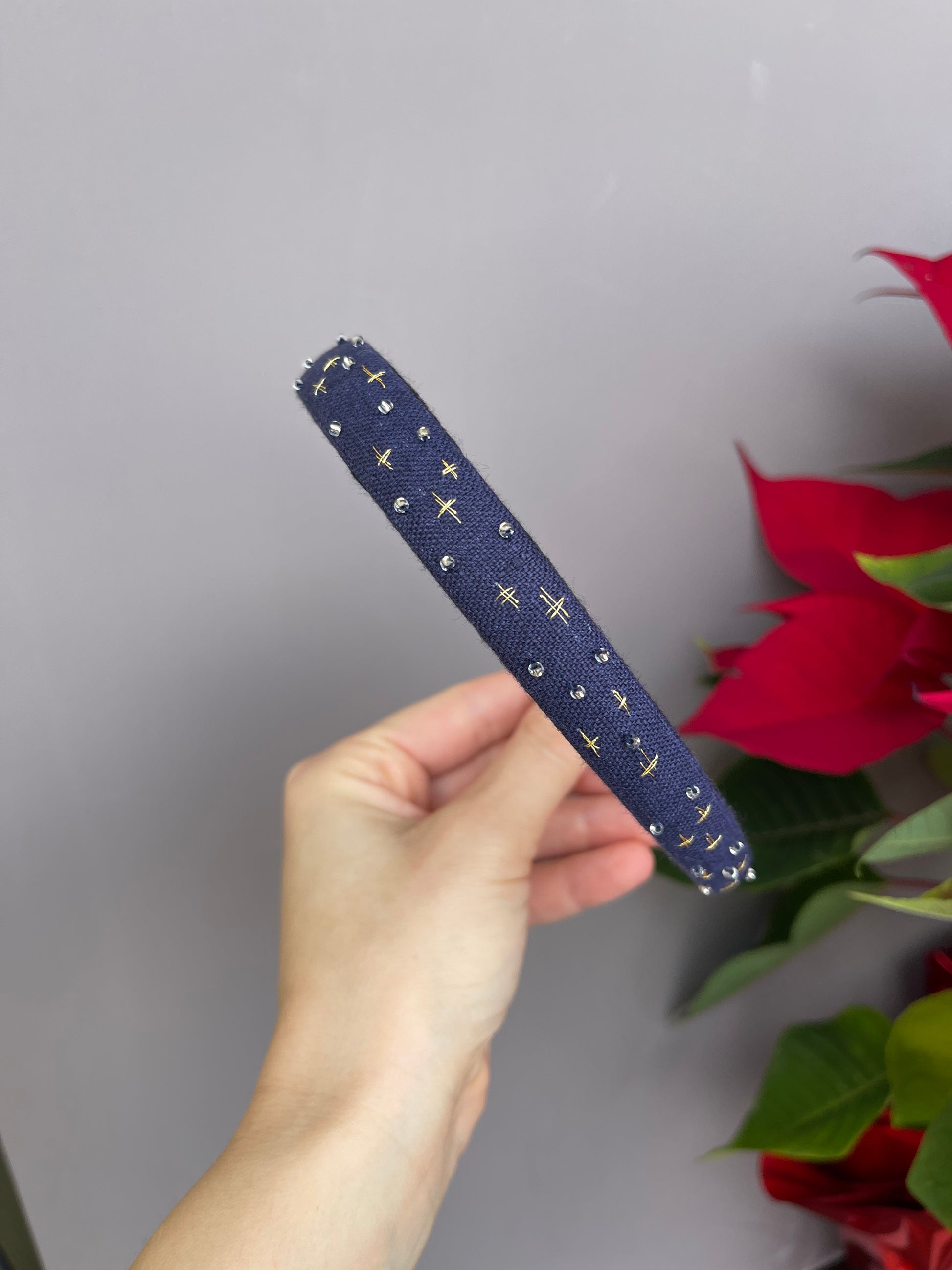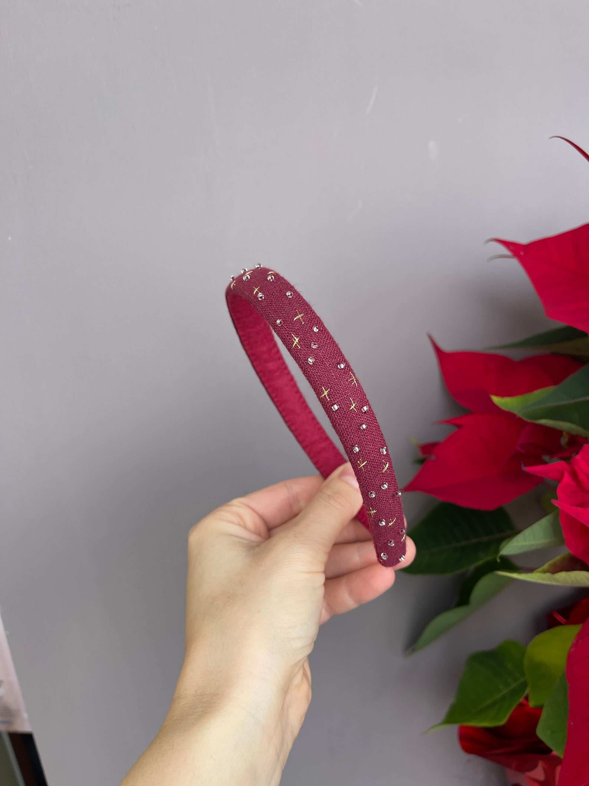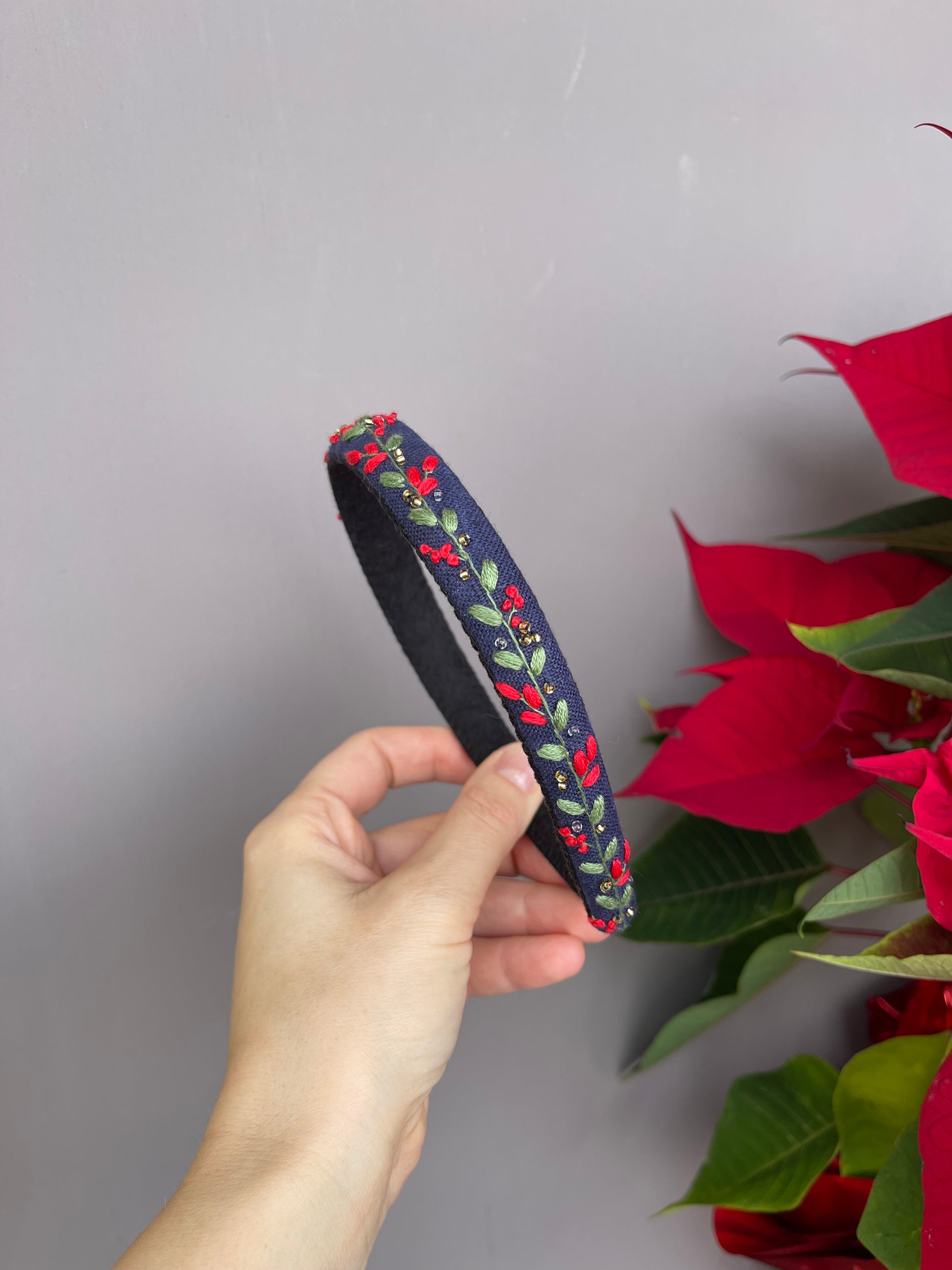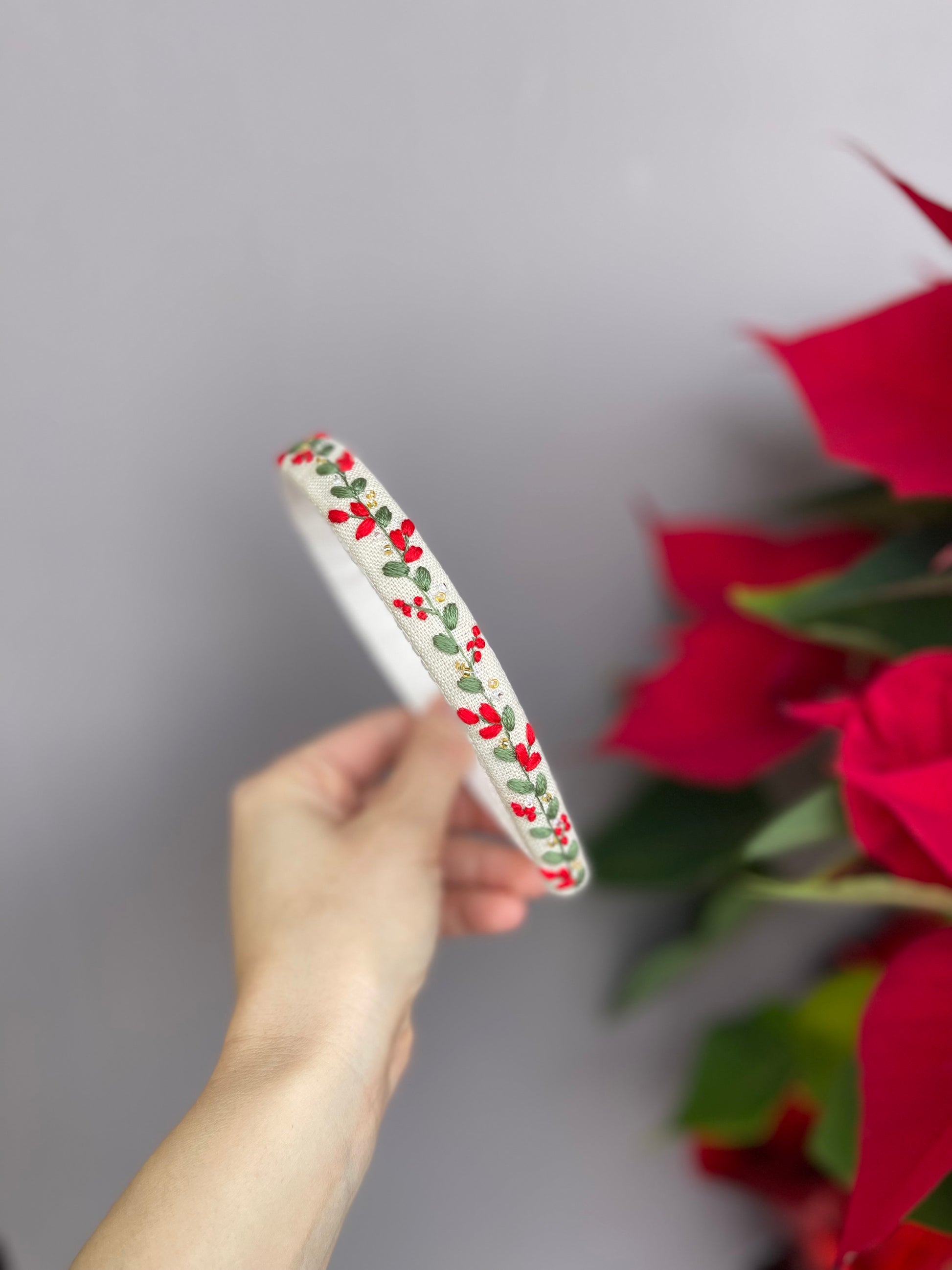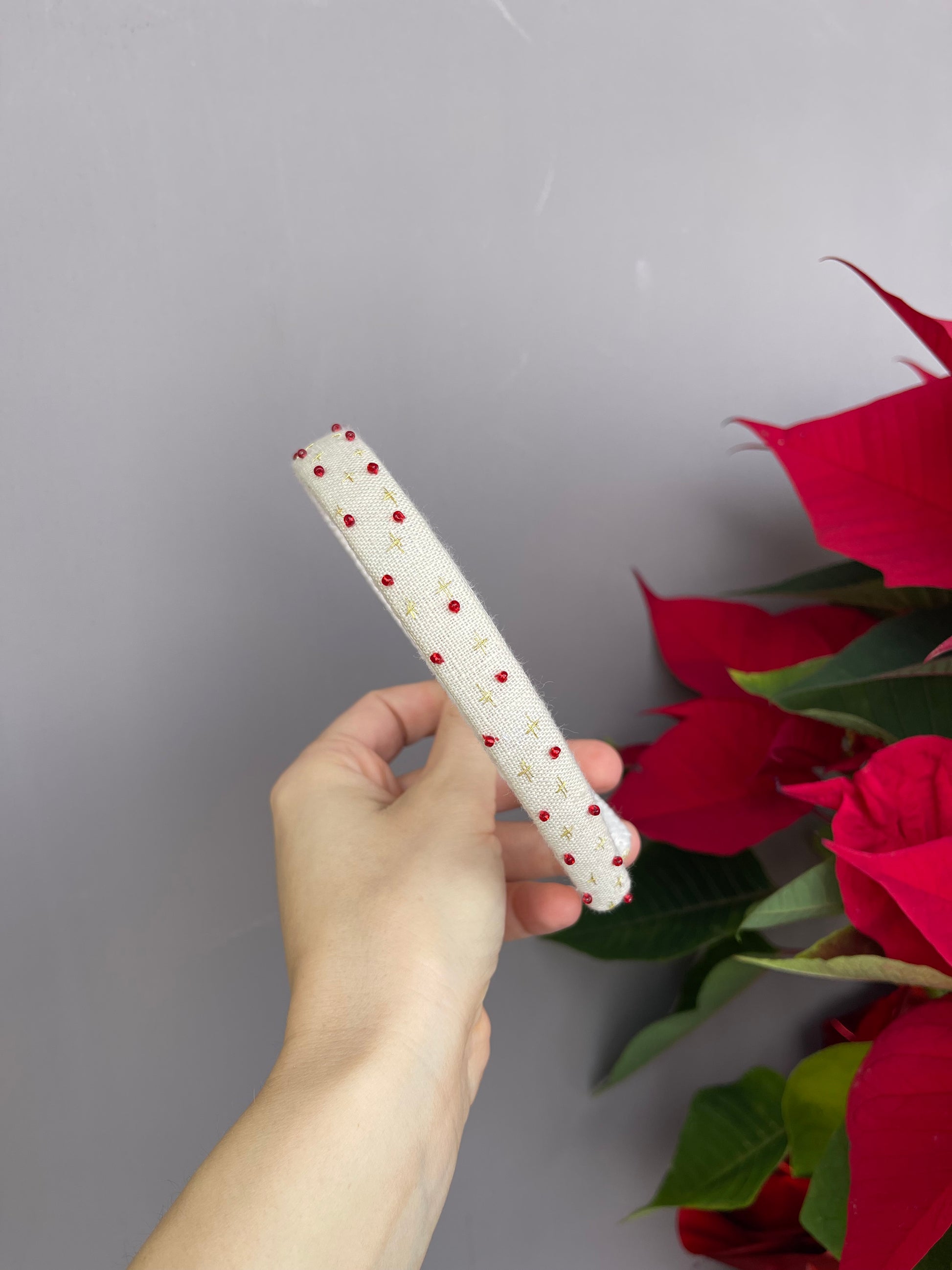 Cerchietti realizzati su una base in plastica flessibile , rivestiti in lino e decorati con ricami eseguiti a mano utilizzando fili da ricamo DMC di alta qualità.