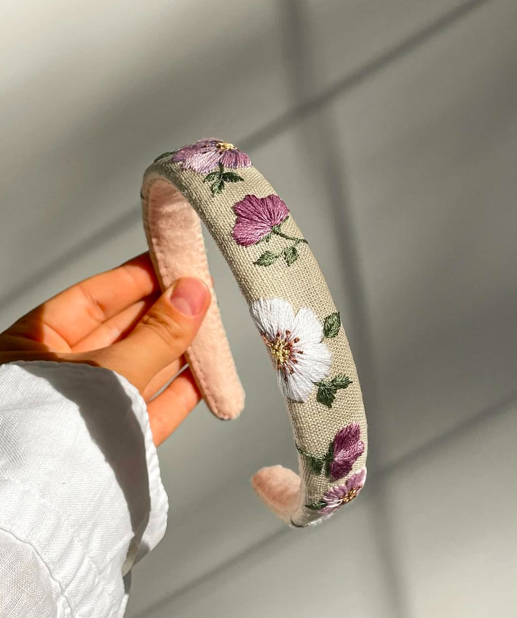 Questo cerchietto artigianale è realizzato su una base in plastica flessibile, leggera e confortevole, adatta a tutte le età: da 4/5 anni fino al mondo adulto. Rivestito in lino beige, è impreziosito da eleganti ricami floreali fatti a mano, che rappresentano fiori di malva nelle sfumature del lilla e anemoni bianchi.