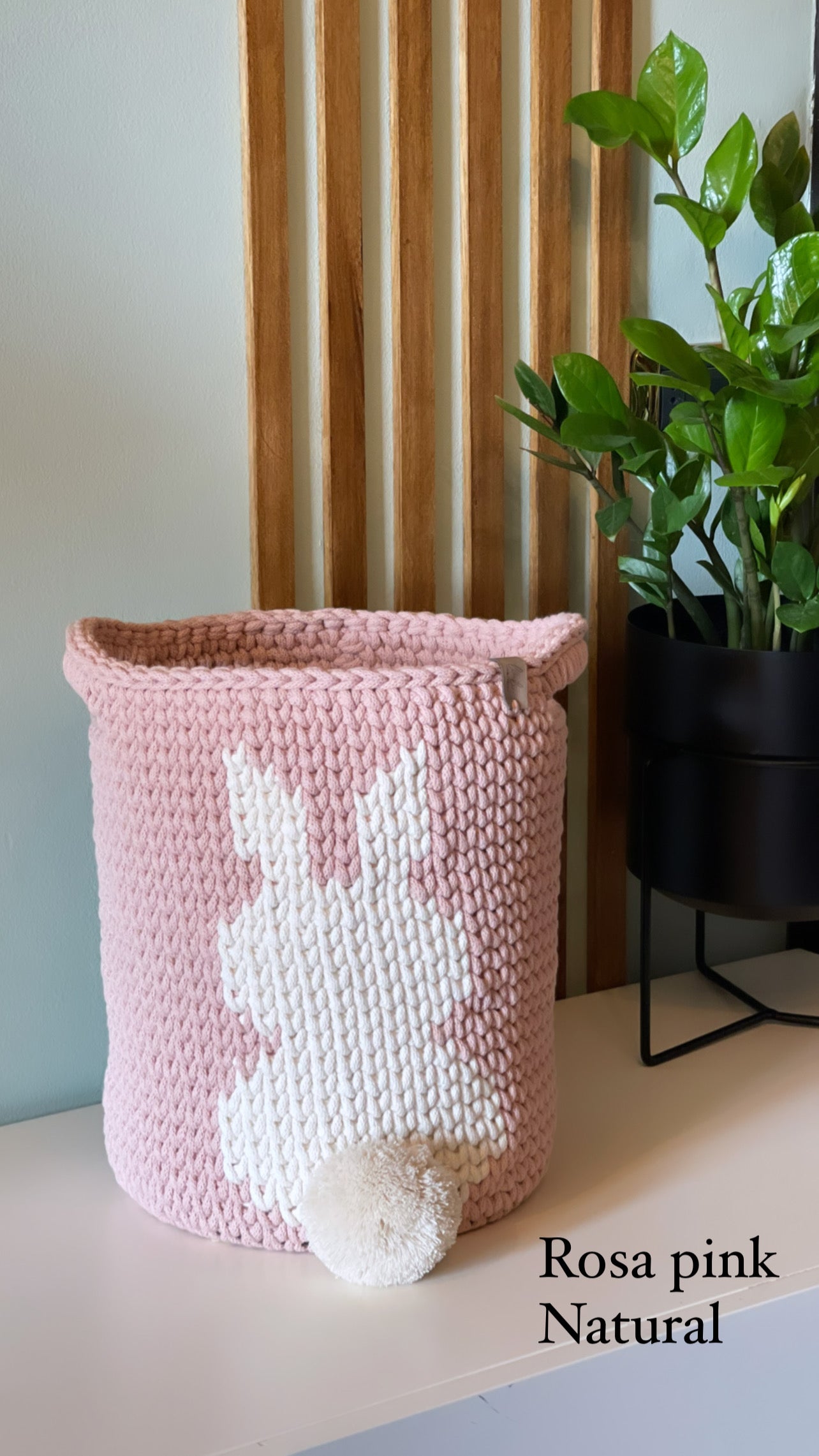 La figura del coniglio , intrecciata con la stessa tecnica, aggiunge un dettaglio originale e giocoso, rendendo la cesta perfetta per la cameretta o per creare un angolo accogliente e allegro.