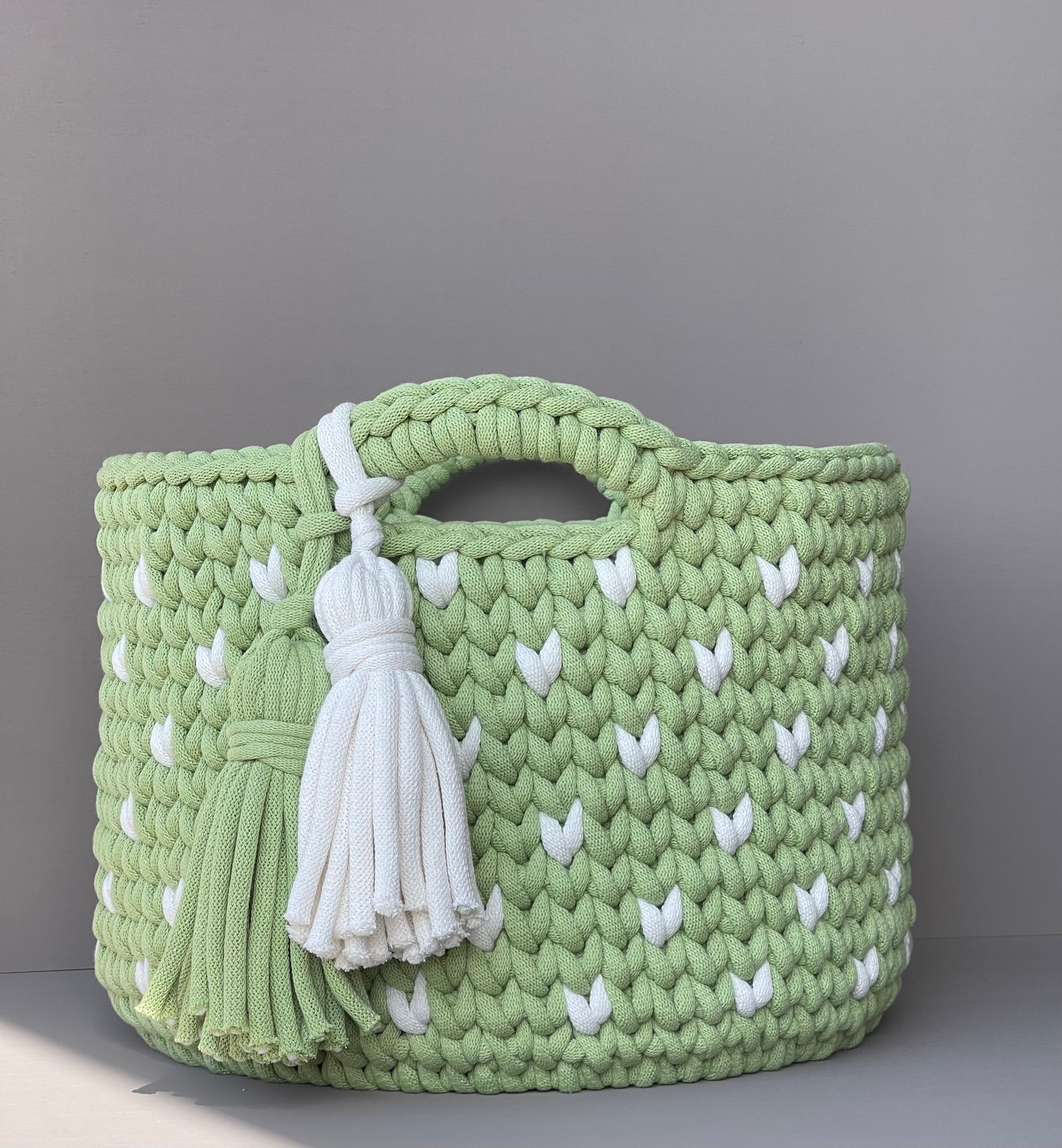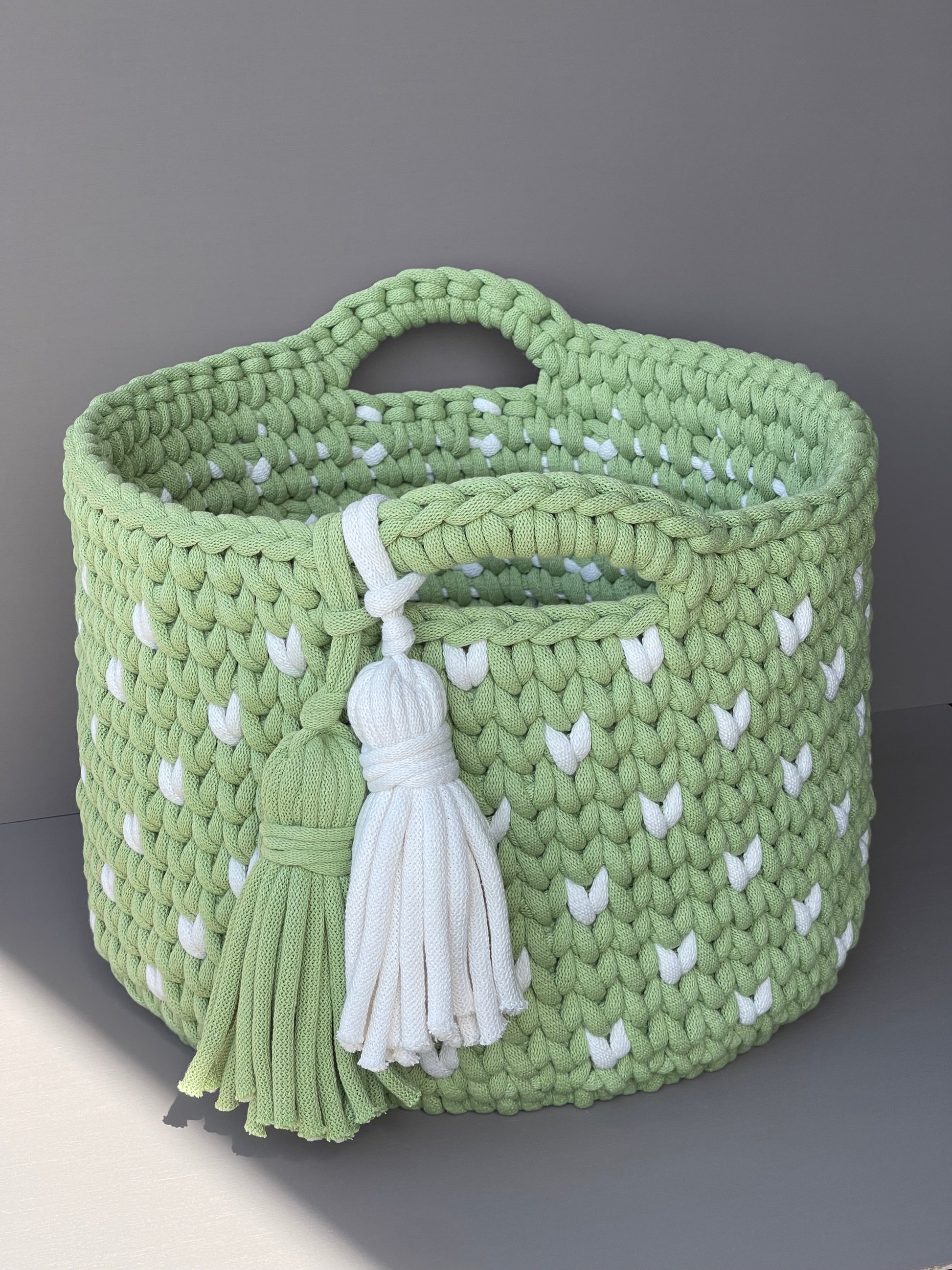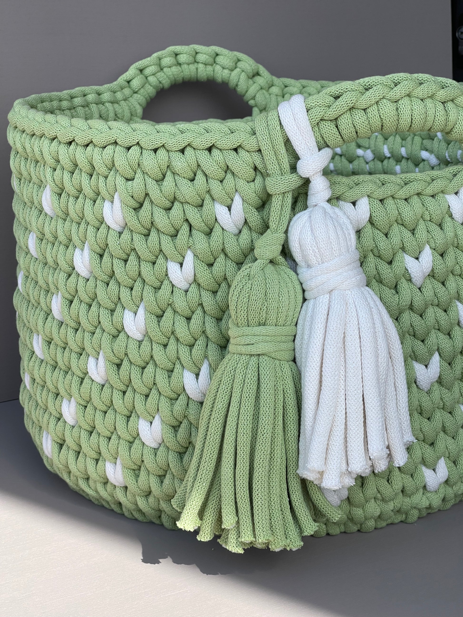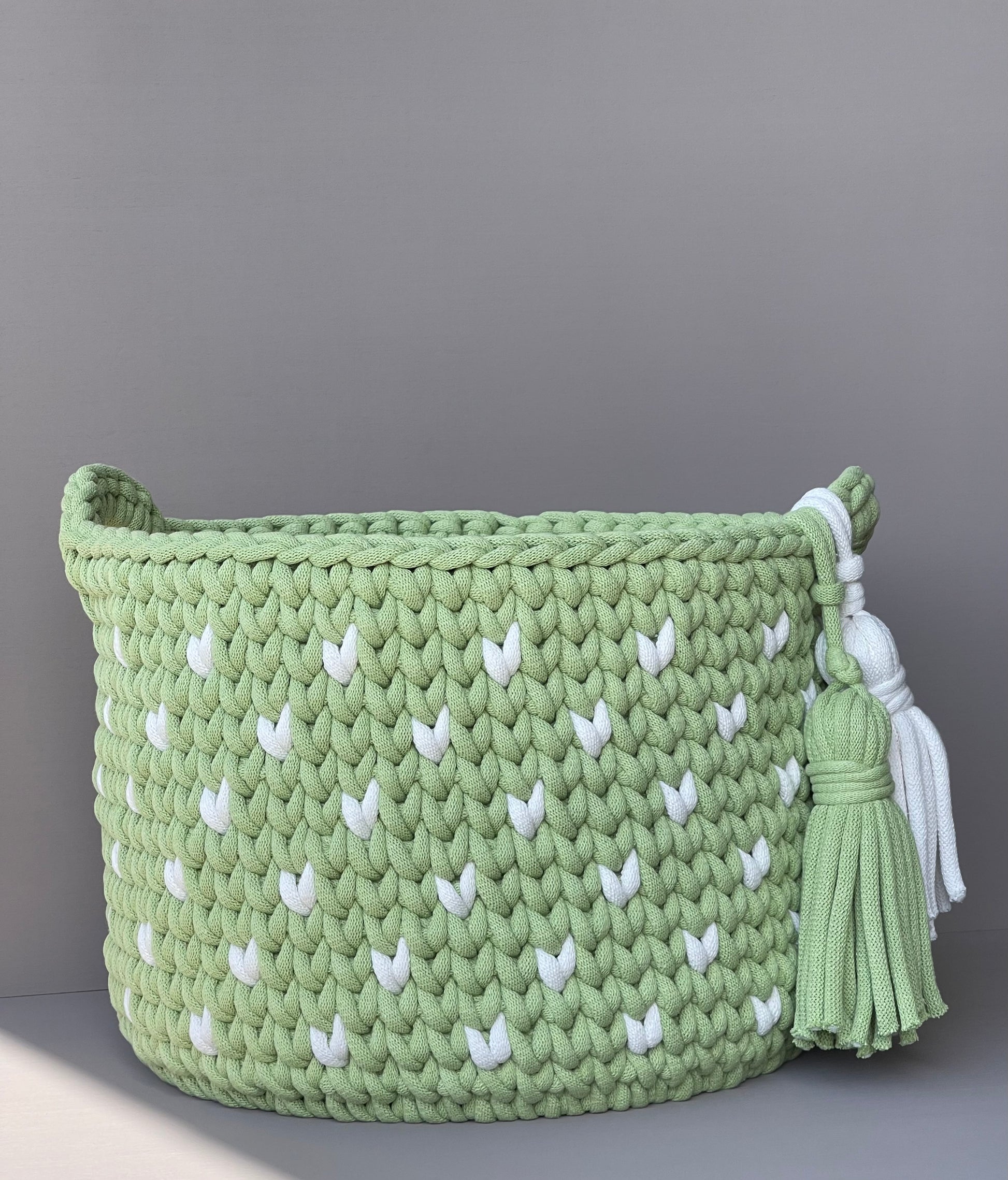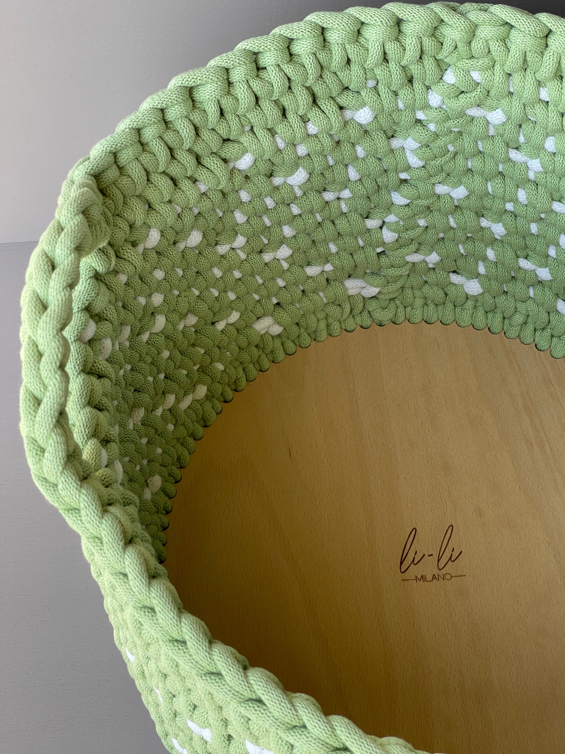 Capiente e decorativa, questa cesta porta oggetti è realizzata interamente a mano con filato in cotone 100% riciclato e anima in poliestere certificato OEKO-TEX® Standard 100 .