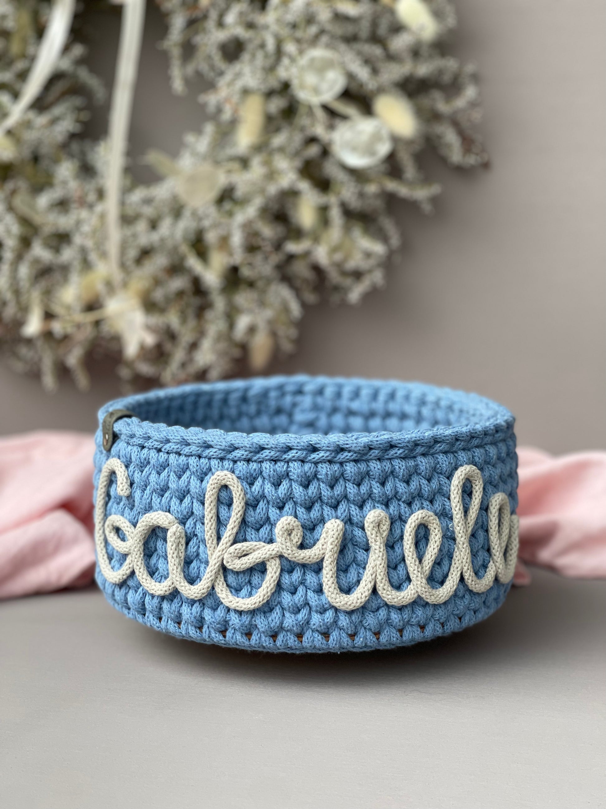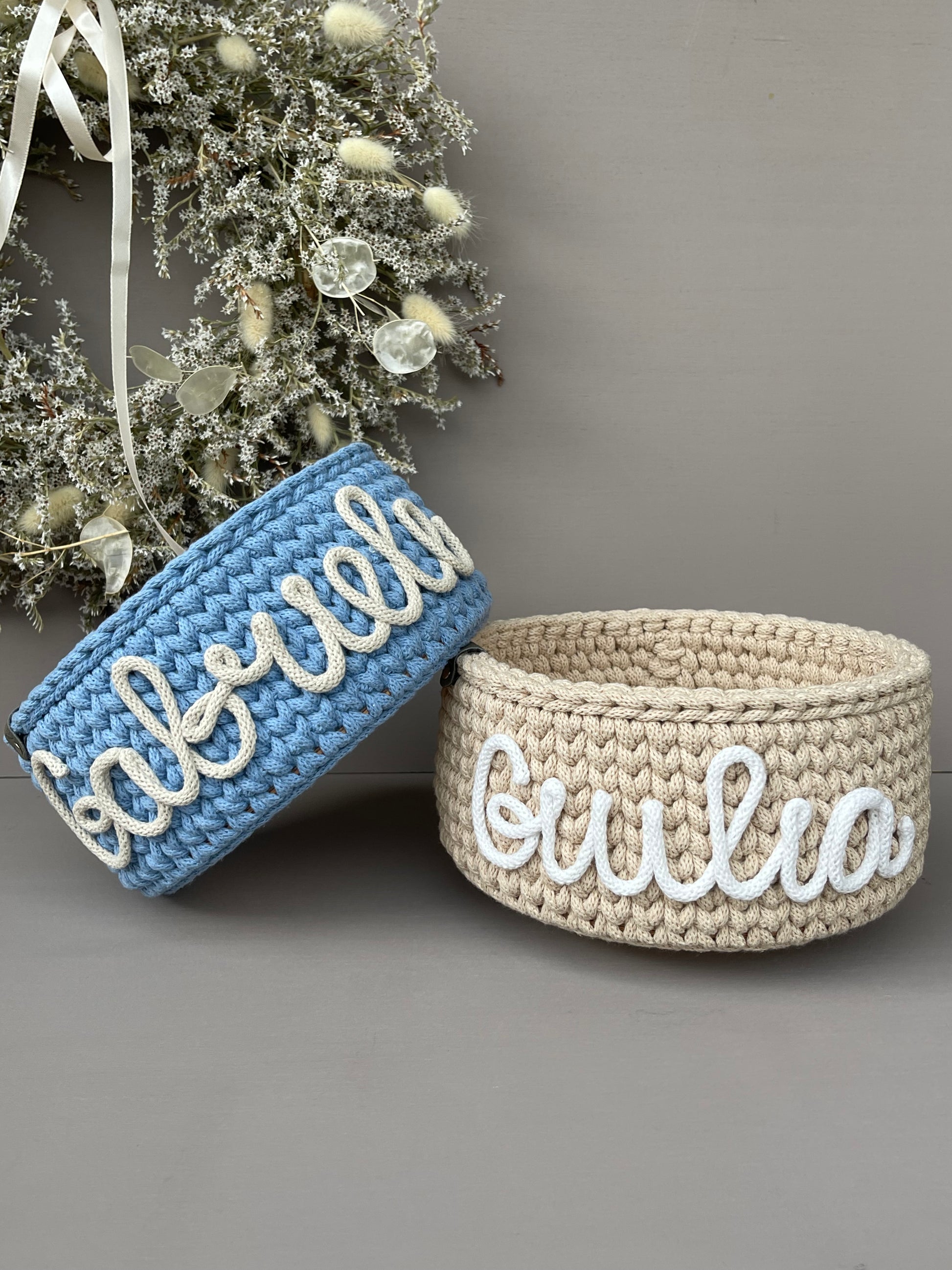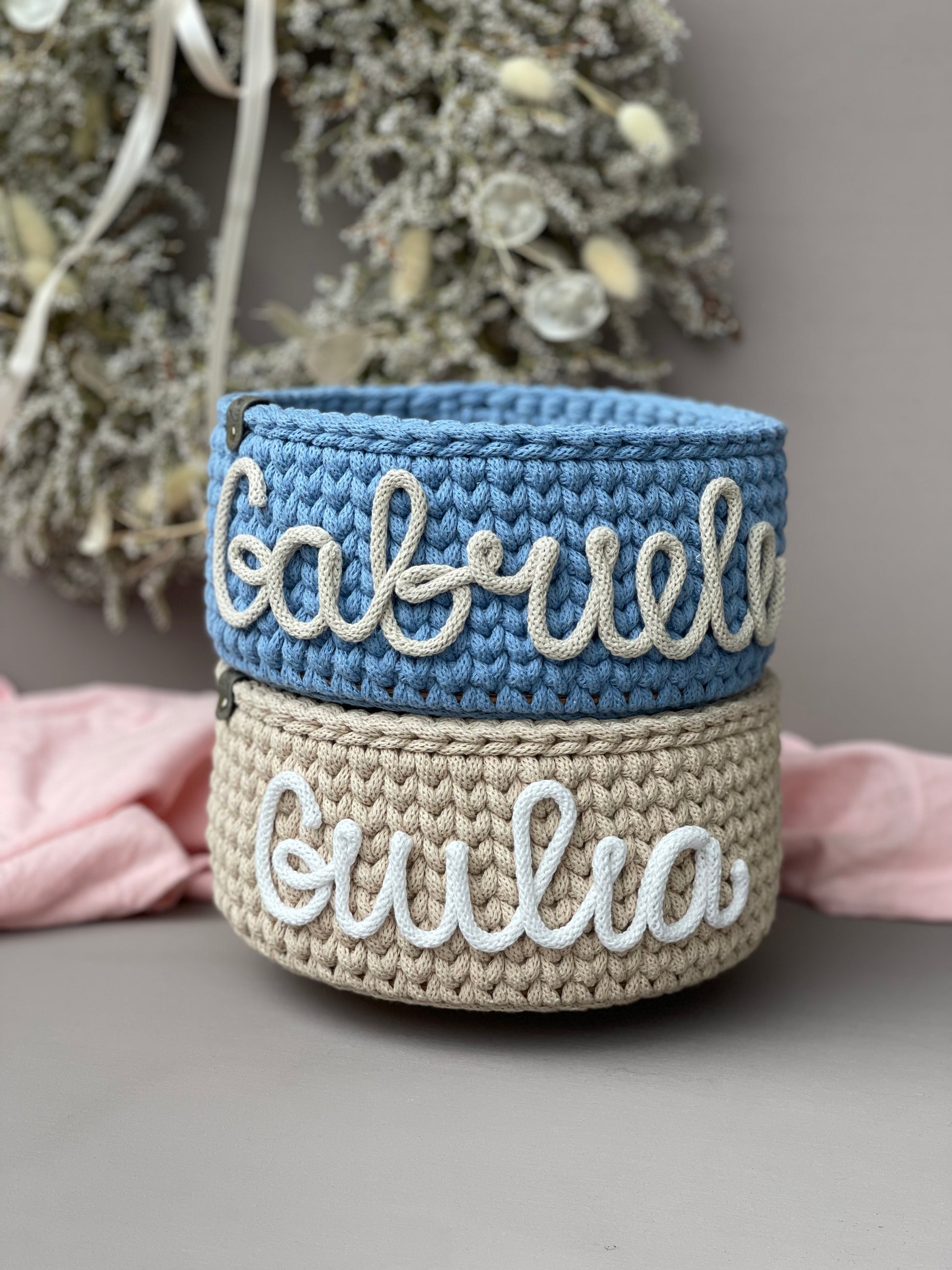 Ogni cestino può essere personalizzato con un nome o una parola realizzata in tricotin — un filo intrecciato che contiene all'interno un filo in alluminio modellabile .