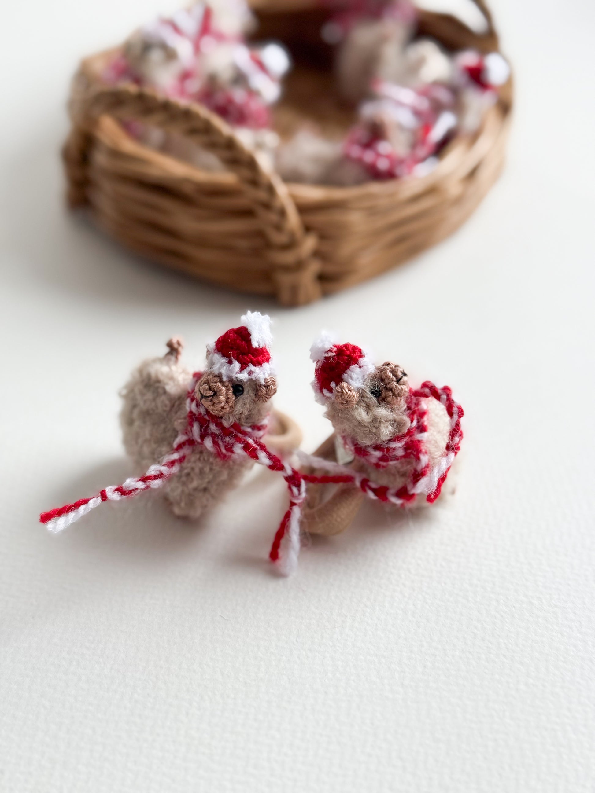 Il suo cappellino rosso e la sciarpina abbinata aggiungono un irresistibile tocco invernale, perfetto per le feste o per dare un accento allegro e originale alle acconciature.