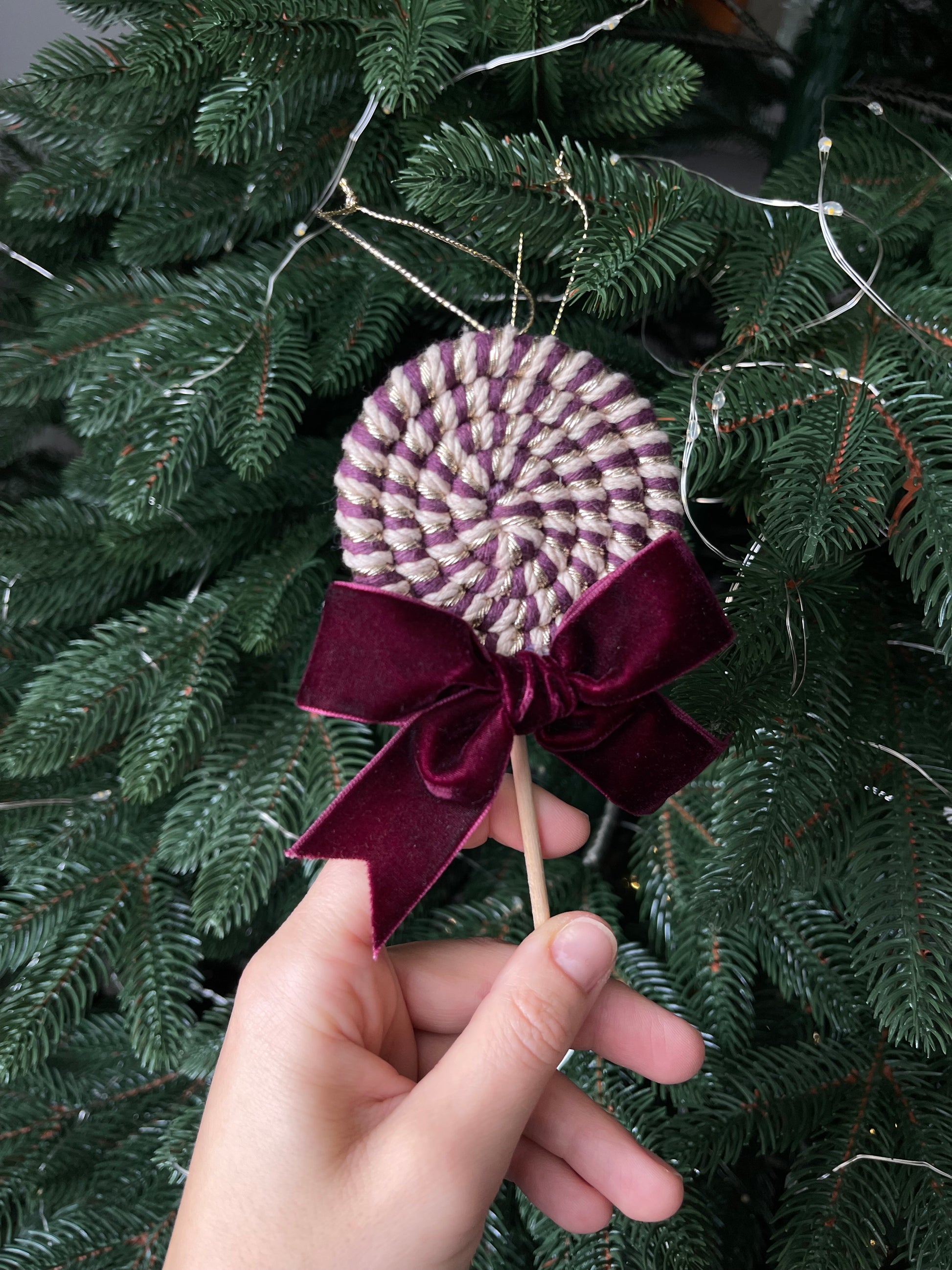 Lollipop in Corda di Cotone. Decorazione realizzata a mano con corde di cotone intrecciate e rifinita con un fiocco in velluto.