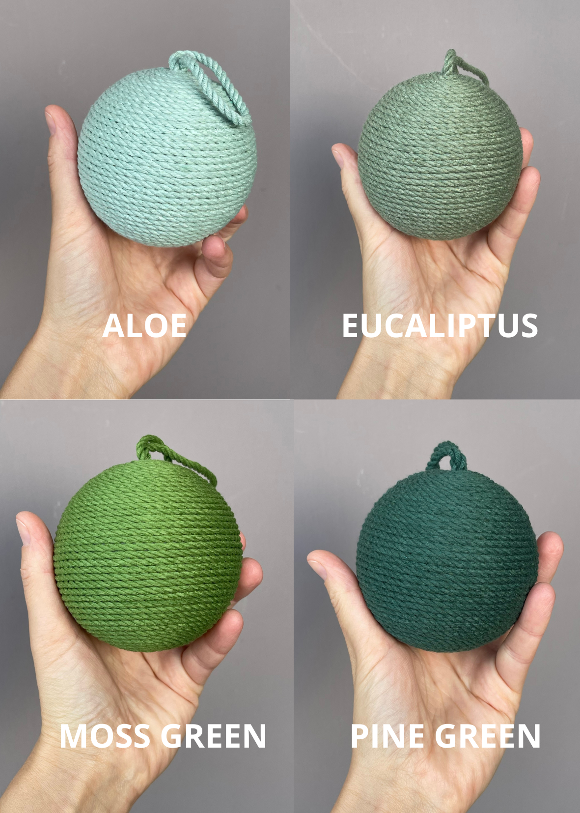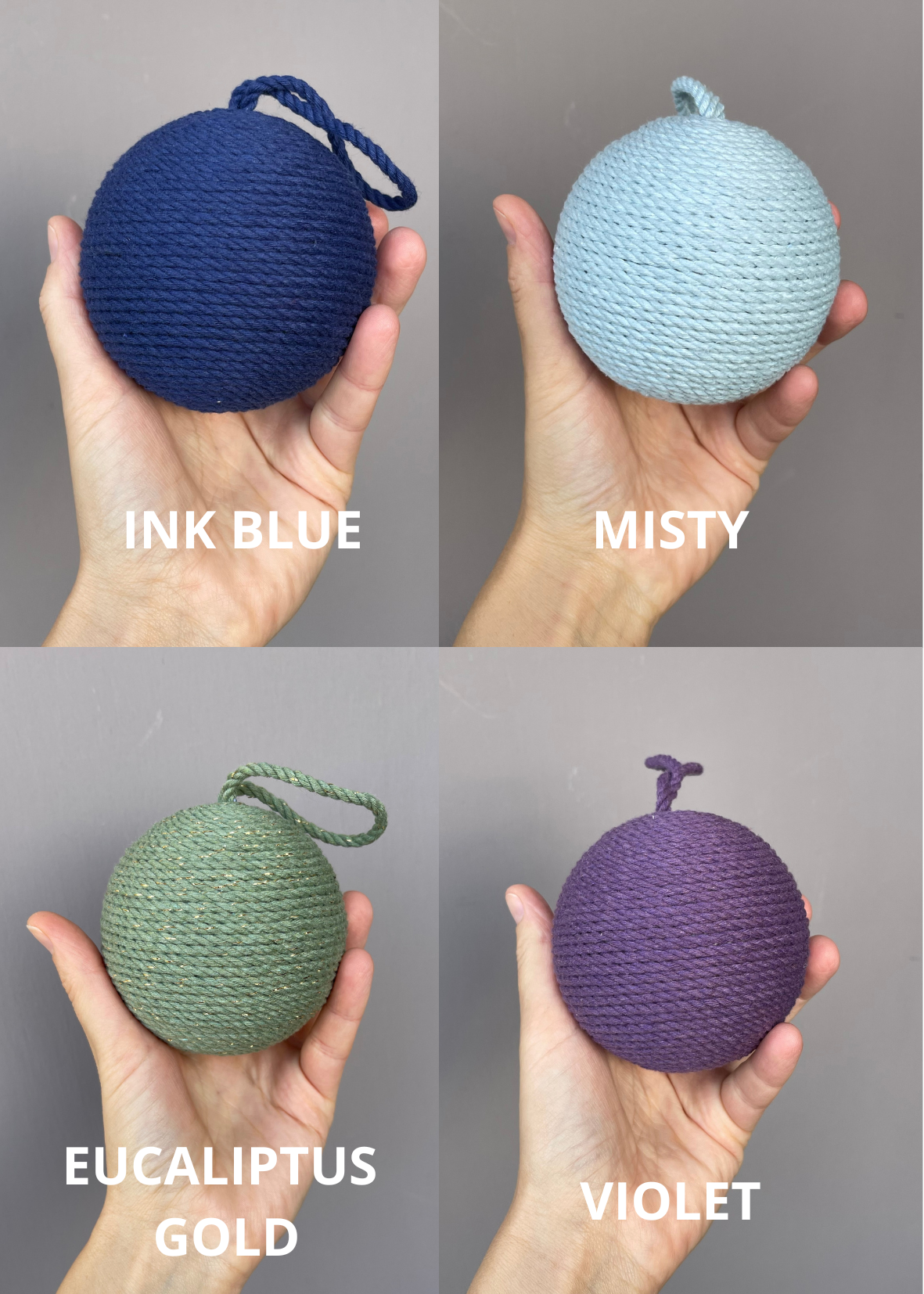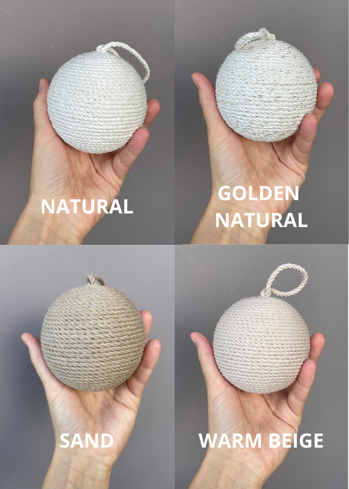 Pallina artigianale realizzata a mano, con base in polistirolo e ricoperta con corde di cotone certificato OEKO-TEX® .