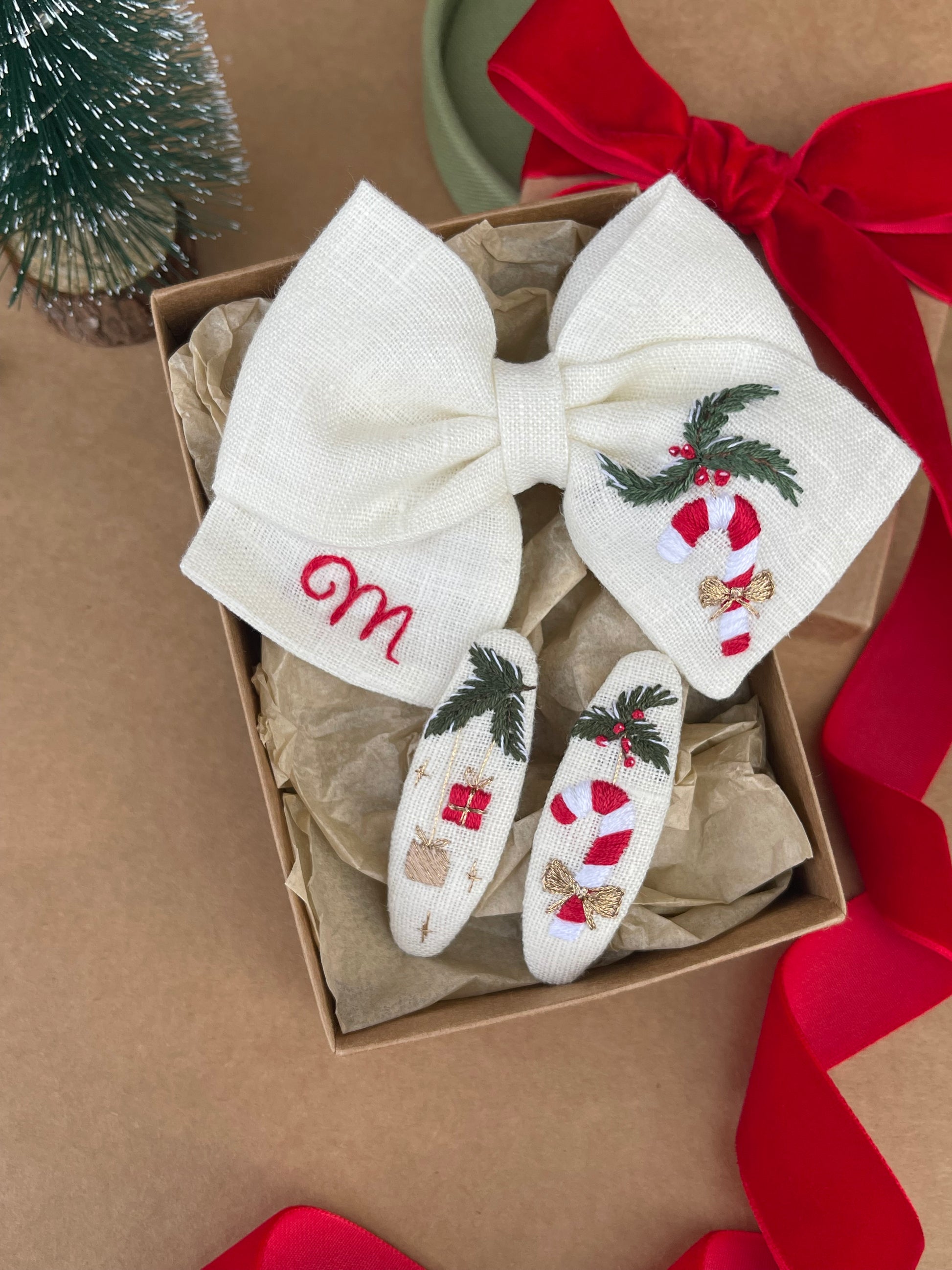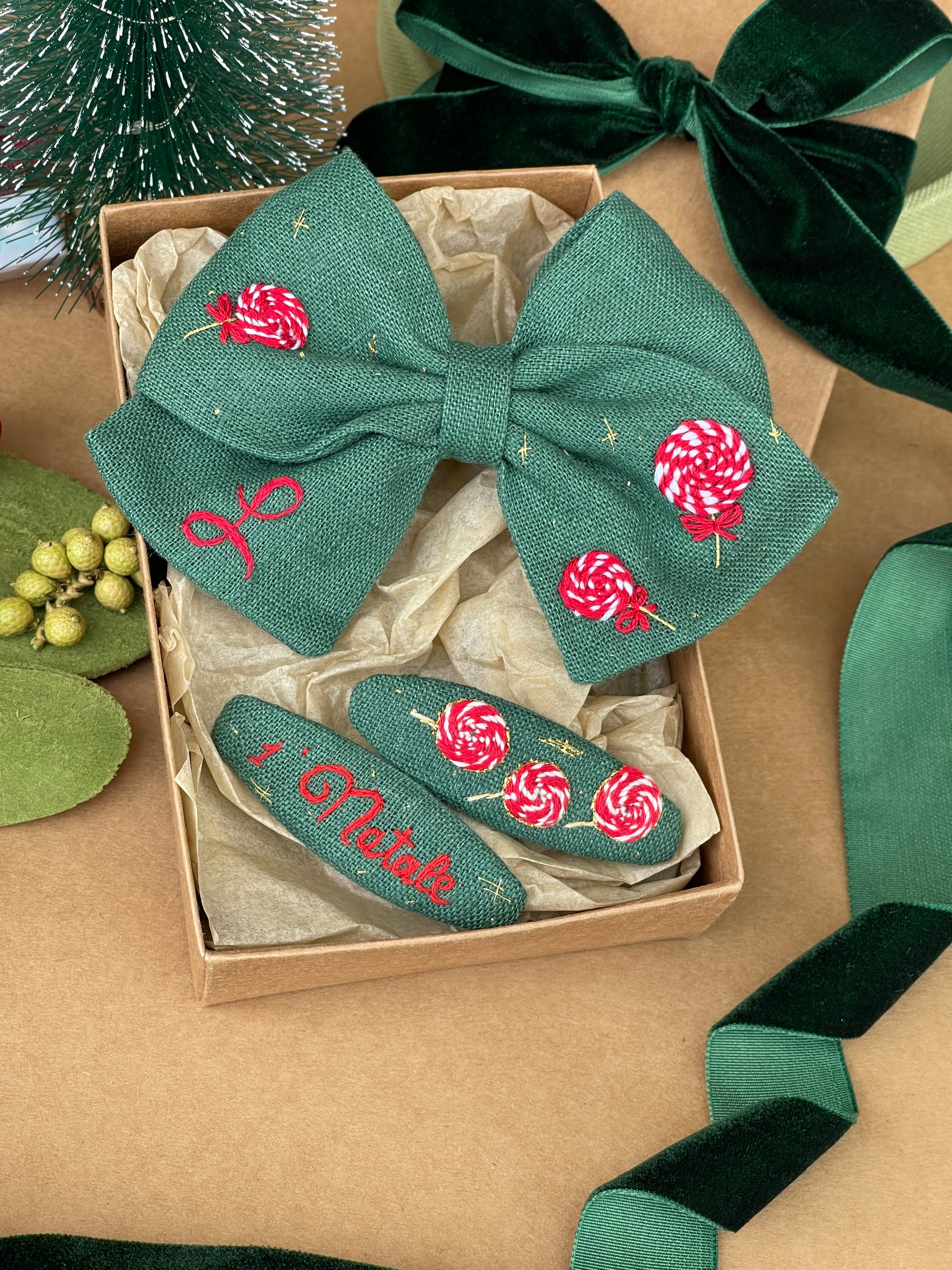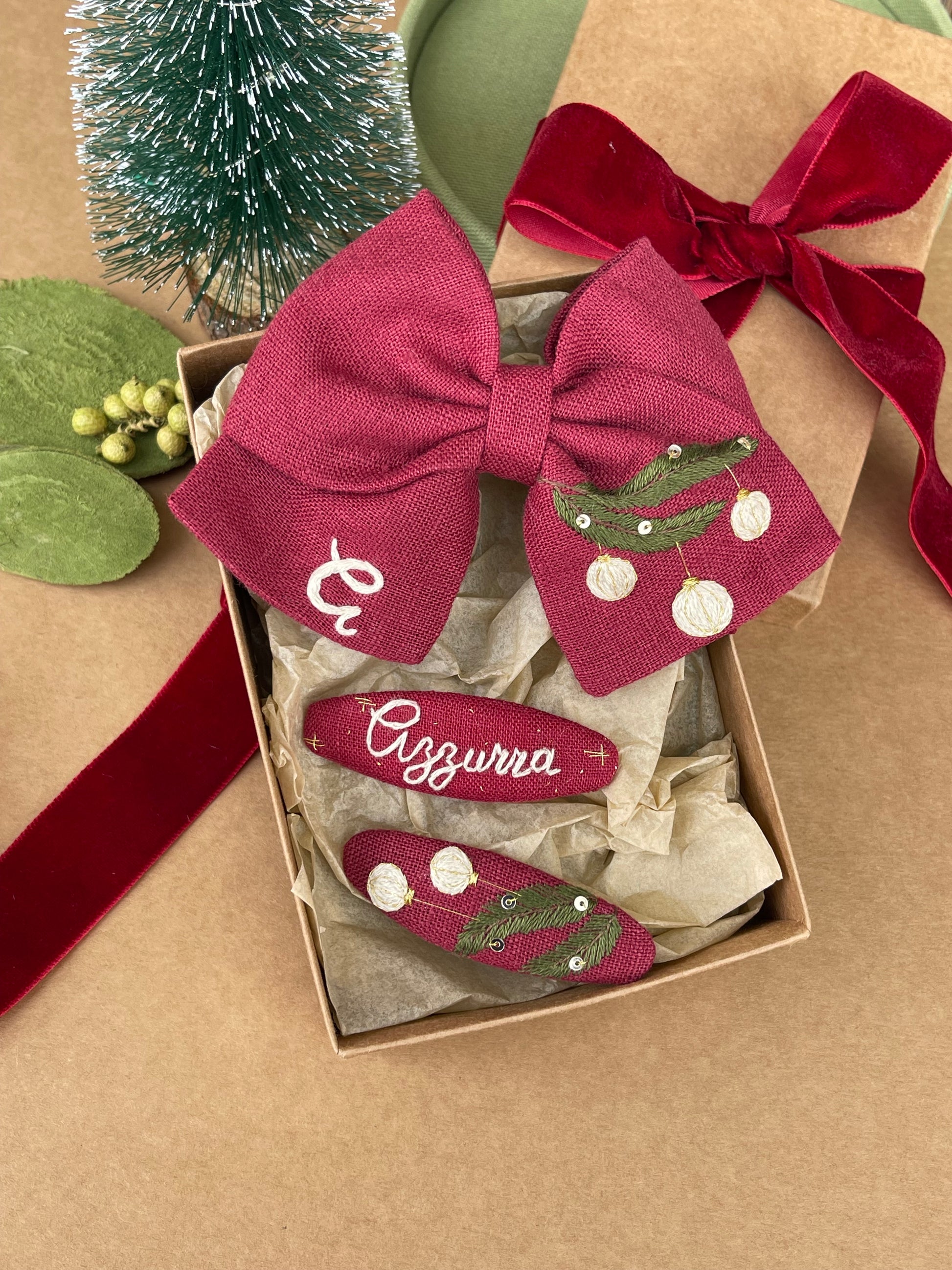 Un set natalizio semplice e curato, ideale per completare acconciature festive o come dettaglio speciale per un ricordo personalizzato.